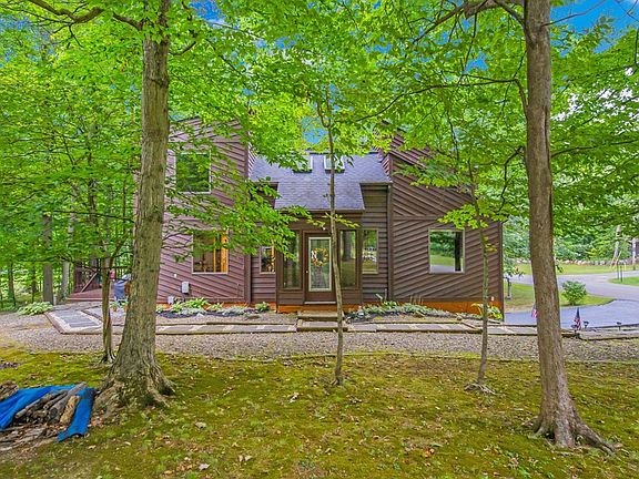 Lakefront home in a wooded, park-like setting! Situated at the end of a quiet, secluded cove on 3 lots and 1.25 acres, this home features a 2-story living room with large, floor to ceiling stone fireplace as the centerpiece, and a full kitchen and dinette. A half bath and two bedrooms, currently used as additional living space and an office, are also on the first floor. A dramatic open staircase leads upstairs to the master bedroom, full bath, and additional bedroom. Downstairs is a full basement and a 2-1/2 car garage. Outside, the deck overlooks large trees and the quiet cove below, with two boat docks. Property also includes a large, detached garage and storage building. Sip your morning coffee enjoying the shaded lake cove and wildlife! House is sold as is. Enjoy the amenities of CWL!