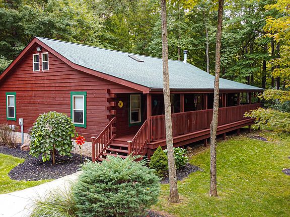 This stunning, custom built log home, is situated on 3 beautifully wooded lots in the Candlewood Lake community. An entertainer lover's dream, the first floor features a kitchen and living/dining area with soaring cathedral wood beamed ceiling, and natural stone fireplace. A spiral staircase leads upstairs to a loft bedroom/sitting area. Also on the first floor is the master bedroom suite, featuring a walk-in closet and full bath, as well as 3 additional large bedrooms. The walk-out lower level has a second full kitchen, living space, office, recreation/game room, and 10 seat home theater room. A concrete driveway leads to a three bay detached garage, with one full bay of radiant floor heating and a bathroom. Outdoors, there is a spectacular, large back deck that overlooks a stream.