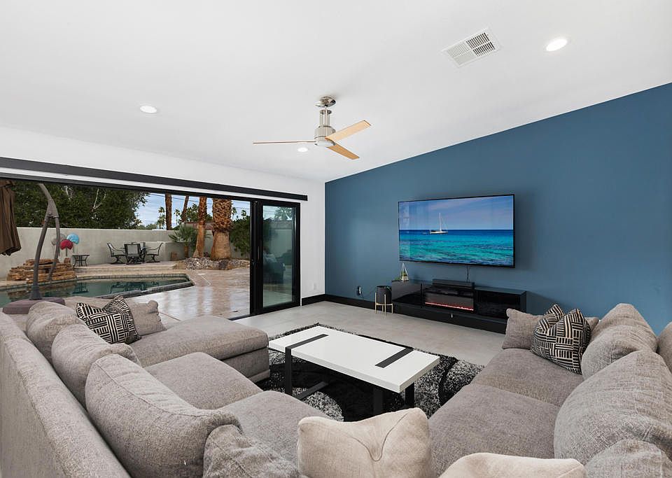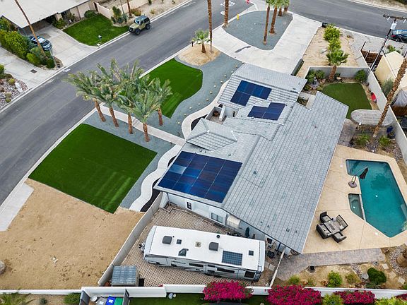 South Palm Desert estate boasts a bright open floor plan with spectacular mountain views! Private living set amid a large South facing corner lot with no HOA dues. Gated outdoor area with ample storage for toys and RV parking including hookups and 6 additional parking spaces. A seamless transition from indoor to outdoor living creates the perfect space to entertain and enjoy the desert lifestyle. Probate does not need court approval. Owner invested approx. $300,000 on remodel and updates. This 3 Bedroom, 3 Bath, plus Office, 2,210 sq. ft. home, sits on a 15,682 sq. ft. lot with updated landscaping, including energy efficient artificial grass. An entertainer's delight featuring saltwater pool, spa, water feature, outdoor shower and palapa tiki-bar. Updates and amenities including newer roof, seller owned solar and solar storage, oversized multi-slide glass panel door, window treatments including electric shades in Great Room and Primary Bedroom, tankless water heater, custom front door, courtyard gate and garage door. Large format tile flooring throughout. Recently remodeled Kitchen, spa like Primary Bath with soaking tub, oversized walk-in shower, rain shower head with 6 hydro-massage body sprays and so much more. Located a short golf cart ride from Shadow Mountain Golf Club, El Paseo Shopping and Dining. Own a piece of prestigious South Palm Desert with this one-of-a-kind property.