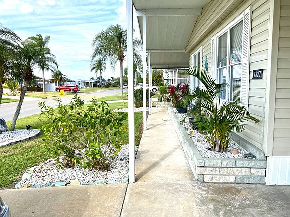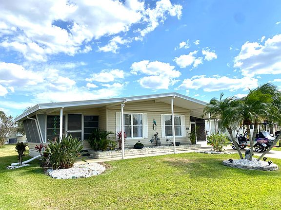 Just Listed $69,900 Turnkey This retirement home is a fantastic opportunity for anyone looking to live in the beautiful Sunshine State. The manufactured home, built in 1979, boasts 1,144 sq ft of indoor living space and features 2 bedrooms and 2 bathrooms. Best of all, it comes fully furnished and equipped - simply drop your bags and enjoy your new home! The exterior of the home is equally impressive, with mature landscaping and a side driveway that can accommodate two cars and a golf cart tandem. An added outdoor screen lanai in the carport area provides a perfect spot for your morning coffee or evening cocktails with friends. There's also an attached utility shed that houses your washer, dryer, and utility sink, along with plenty of room for tools, beach gear, and overflow storage. Inside the home, the kitchen is fully equipped and features upgraded cabinets and a few appliances. Many windows and a front-facing view offer plenty of beautiful Florida sunshine, while a spacious living room leads to another side lanai under AC - a great place to relax or turn into an office. The guest bedroom is large and can accommodate a king-size bed, along with a nice sized closet. The master ensuite is equally spacious, with a large walk-in closet, step-in shower, and a large single sink vanity with storage underneath. This home also has great curb appeal with a spacious backyard and a water view. The AC is only a year old, and the roof is metal and is power washed and sealed regularly. Updated stainless WIFI refrigerator, washer and dryer. These appliances are all less than a year old. The dishwasher is also new. The flooring is solid and has been updated throughout, along with fresh interior paint. New vapor barrier 2022. As for the community, it offers not only 6 community pools but a wealth of amenities for residents to enjoy. You'll be able to take advantage of everything from fitness centers and tennis courts, fishing pier and community events. Plus, the location is ideal - you'll be just a short drive away from shopping, dining, and other attractions. Overall, this retirement home is an incredible opportunity to live the Florida dream in comfort and style. Don't miss your chance to make it yours! Colony Cove is an age qualified (55+) five-star resort community of manufactured / mobile homes. The "Cove" boasts 5 clubhouses, 6 heated pools, a riverfront pavilion and private fishing pier, a private marina, a fenced dog park (very pet friendly), tennis, shuffleboard, new pickleball courts, 2 new fitness rooms, 24-hour patrol, clubs for every interest, and much more. There are daily planned activities throughout the park. Bottom line, if you get bored here, it's your own fault!! The lot rent in Colony Cove is based on the homes' location. While the monthly rent may not be the lowest around, it's by far the best value for the money. Not only does the monthly rent cover all of the amenities of the community listed above, it also covers almost all other monthly expenses such as; water, sewer, trash pickup, all property taxes, lawn maintenance. . .pretty much every monthly expense except electricity and internet. The current lot rent on this home is estimated at $1098.23 per month. All listing information given to us is considered appropriate and reliable but always recommend Home Inspections by independent companies who have a background and thorough understanding of manufactured homes. We cannot guarantee the accuracy of information given to us or the condition of the home. Lot rents are determined by the community office not our company.