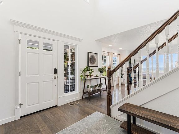 Tucked into a quiet cul-de-sac and backing to lush greenspace, this spacious, fully remodeled home offers serene views and refined livability. Thoughtful updates throughout include engineered hardwood floors, quartz countertops, stainless steel appliances, zoned heating, and new AC and water heater systems. The remodeled kitchen centers around an expansive island and opens to formal living and dining areas anchored by a cozy gas fireplace. A main floor office with a closet offers flexibility for guests or remote work. Upstairs, the oversized primary suite is a true retreat with a luxurious ensuite bath featuring a jetted tub and large picture window that frames the trees beyond. Generously sized bedrooms, a large daylight basement with backyard access, and both upper and lower Trex decks offer room to spread out and connect with the natural setting. Located on a pristine, dead-end street just down from the neighborhood park, this meticulously cared-for home pairs privacy and beauty in one of the area’s most peaceful pockets. Three-car garage, fenced flat yard, whole-home surge protector, and new carpet upstairs complete the package. [Home Energy Score = 4. HES Report at https://rpt.greenbuildingregistry.com/hes/OR10031576]