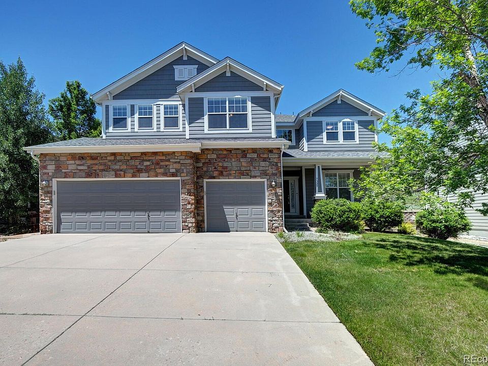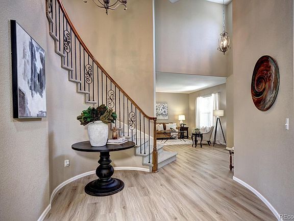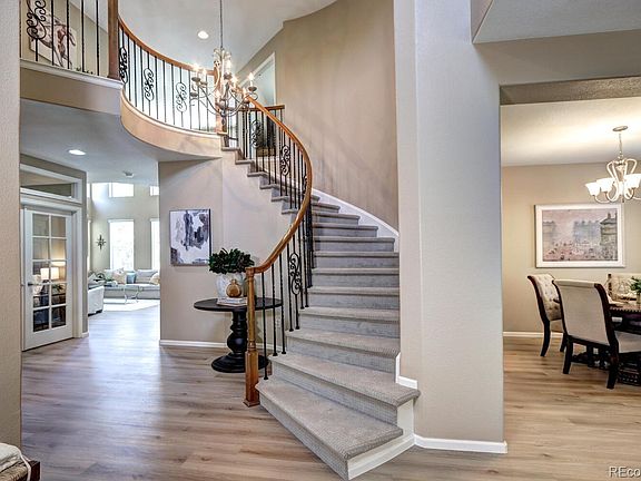 Located on a quiet cul-de-sac in the heart of Castle Pines and just steps from Coyote Park offering concerts, basketball, pickleball, playground and miles of scenic walking/biking trails! Stunning 5 Bedroom, 5 Bathroom home blends elegance, comfort and functionality. The front porch welcomes you into a grand Foyer with soaring ceilings and a sweeping spiral staircase, setting the tone for the thoughtfully designed open-concept layout. Updated main level flooring and a neutral paint palette creates a warm, cohesive atmosphere throughout. A formal Living/Dining Room with butler’s pantry provides the perfect setting for entertaining guests. The updated chef’s Kitchen features cherry cabinetry, newer stainless appliances, granite counters, tile backsplash, island, pantry, breakfast bar seating and a spacious eating area ideal for daily living and hosting alike. The spacious Family Room showcases vaulted ceilings, cozy fireplace and abundant natural light. A private main-floor study/den with built-ins offers a quiet workspace, while the well-appointed Laundry Room includes washer/dryer, utility sink and storage cabinetry. 3-Car Attached Garage! Upstairs, the Primary Suite is a tranquil retreat with vaulted ceilings, fireplace, walk-in closet, updated flooring plus a luxurious en-suite 5-piece Spa Bathroom with soaking tub. 3 additional Bedrooms offer flexible living arrangements: 2 share a Jack-and-Jill Bathroom, while the 3rd has its own en-suite Full Bath. The Finished Basement offers 1,652 SF of expanded living space including a Game Area with pool table, Bonus Room with surround sound and bar, a 5th Bedroom plus a ¾ Bathroom perfect for guests or multi-generational living. Step outside to enjoy the beautifully landscaped, private fenced yard with patio providing a serene, outdoor oasis ideal for casual living or entertaining friends. Don't miss your opportunity to be a part of this vibrant community!