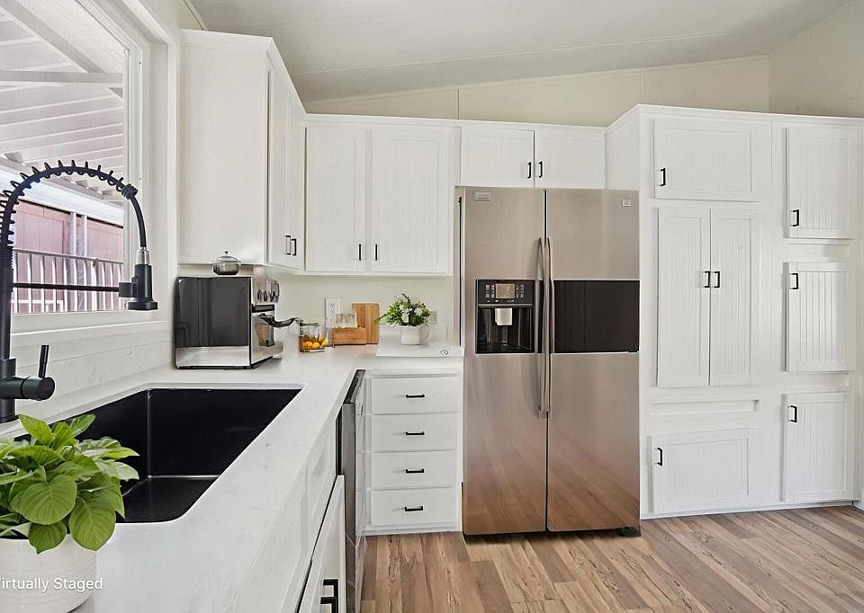 Complete interior remodel with vaulted ceilings throughout! This light and bright home features an open-concept living room, kitchen, and dining area, beautifully updated with vinyl plank flooring, quartz countertops, stainless steel appliances, energy-efficient windows, recessed lighting, and ceiling fans. The spacious primary suite includes a private bath with a large soaking tub and separate shower. Two additional bedrooms are thoughtfully positioned on the opposite side of the home and share a stylish hall bath--ideal for guests or office use. The oversized laundry room offers ample counter space and built-in cabinetry for added convenience. Outside, enjoy a private patio area, covered carport, and an additional storage shed. Best of all, you own the land--no space rent--and benefit from low annual HOA dues. Located in Tri Palm Estates and Country Club, a vibrant 55+ community where your low monthly club fee includes unlimited golf for two deeded owners on both the 18-hole executive course and 9-hole par 3 course. Additional amenities include two outdoor pools and spas, lighted tennis and pickleball courts, shuffleboard courts, two putting greens, and a clubhouse with dining, banquet space, bar lounge, and a full calendar of social activities. Conveniently located near freeway access, Costco, Sam's Club, Home Depot, Walmart, Lowe's, movie theaters, and an array of great restaurants. Just a short drive to Agua Caliente Casino, Acrisure Arena, Rancho Mirage, and South Palm Desert shopping. Bonus: this home is in the IID service area for lower electric costs!
