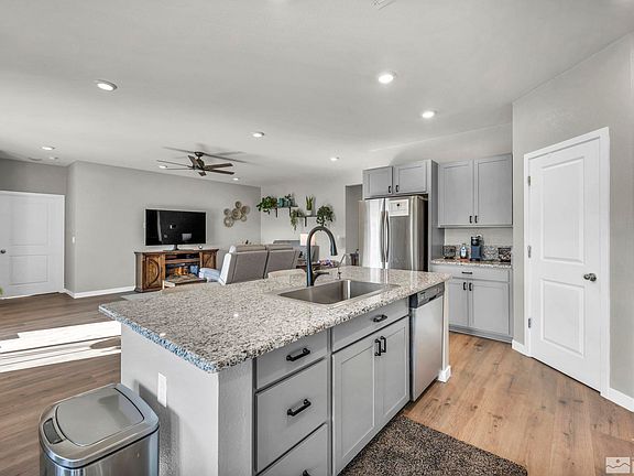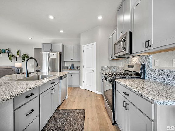 Discover this move-in ready home in the sought-after Alpine at Sage Canyon. This beautiful single-story residence spans 2,035 square feet and features an inviting open floor plan. Enjoy comfortable living with 4 spacious bedrooms and 2 bathrooms, along with a convenient 3-car tandem garage and a separate laundry room. The kitchen is a chef's delight, boasting granite countertops, an island, and a walk-in pantry. With 9-foot ceilings throughout and a generous primary suite with walk-in closets., This beautifully crafted single-family home by DR Horton is truly move-in ready! The sellers have invested significantly in upgrades, showcasing quality finishes throughout. Enjoy the elegant granite counters in the kitchen, complemented by stainless steel appliances and stylish maple cabinets. The upgraded flooring enhances the home’s appeal, making it feel both modern and inviting. Step outside to your private backyard oasis, complete with stunning views—Don't miss your chance to see this gorgeous property that shows like a model home; it won't last long!