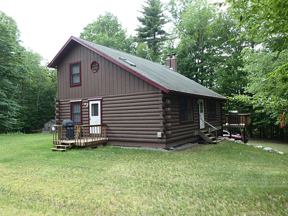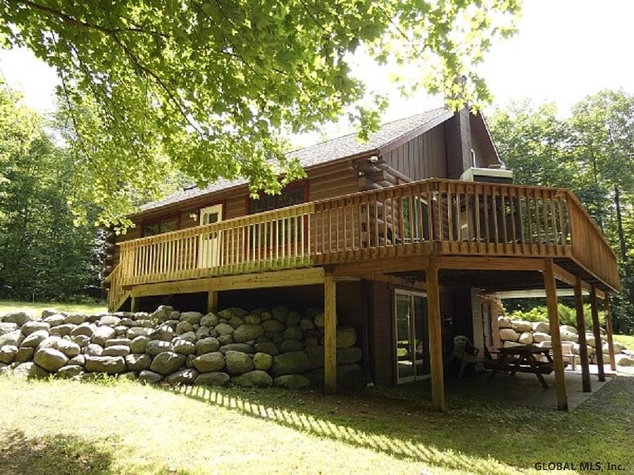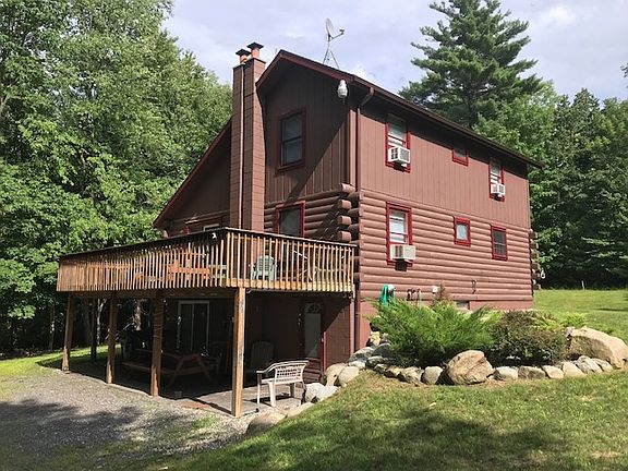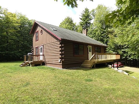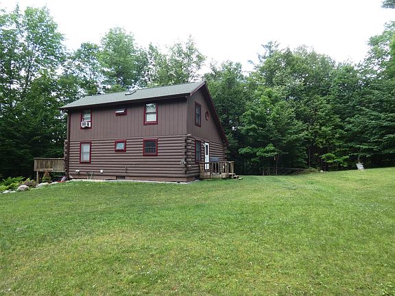 Well maintained log home nestled on 4.91 acres with private driveway. Knotty pine interior, vaulted ceiling, pellet stove @ LR, modern kitchen with dining area. Large wrap around deck, finished walkout basement with family room and sleeping (BR) and laundry. Carpet, harwood, tile. (Original plans show master on main level, conversion back with wall construction). Only 5 minutes to downtown Bolton.