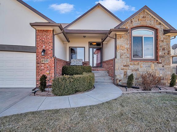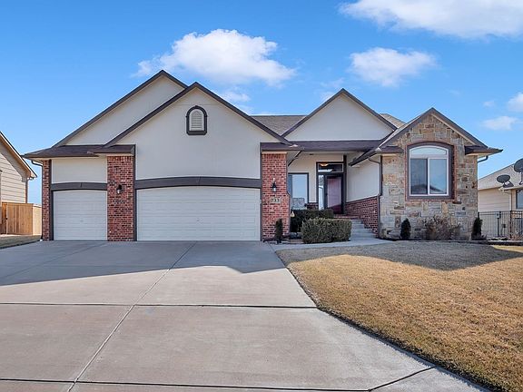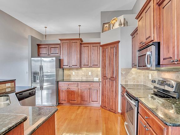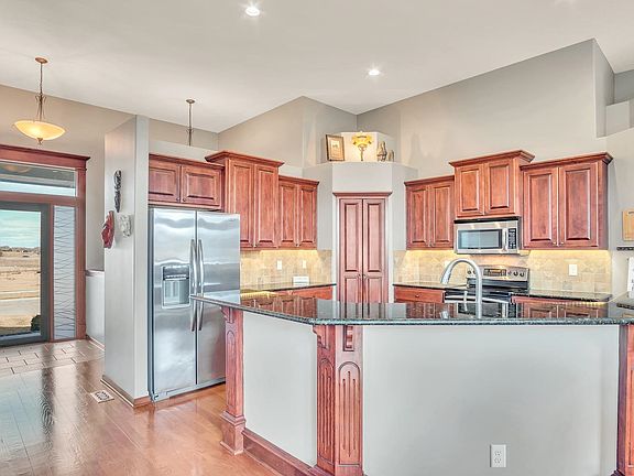 Beautiful property in Sand Creek Station. You will love the floor plan! Living, kitchen and dining open to each other. Floor to ceiling transom windows bring in sunny southern natural light. Custom trim work throughout. Gas fireplace is a focal point, framed with windows and a built-in flat screen area. You will love the kitchen detail with staggered cabinets in both depth and height with cove trim molding. All appliances included, eating bar area with seating for 4, under and upper cabinet lighting, walk in pantry, granite countertops, pull out shelving, coffee bar area and hard wood floors! Separate main floor laundry room with hang bars, storage and a great built-in catch all! The dining area includes a recessed area for a buffet, hard wood floors and covered deck access. Enjoy the split bedroom plan with room for guests or a main floor office. The master suite is lovely with even more detail and hard wood floors. Vaulted coffered ceiling with recessed panels and wood trim, triple windows above the bed for additional natural light in addition to the large picture window, bath with garden tub, oversized separate shower, double vanity with granite countertops, cabinet storage, large walk-in closet with built ins and seasonal hanging. The basement is fully finished with rec room, wet bar with fridge, 4th and 5th bedrooms, full bath and so much storage space! The curb appeal of this home is fantastic! Brick and stone accents, NEW ROOF, oversized three car garage just painted, NEW exterior paint, sprinkler system, irrigation well and large oversized patio. Enjoy the area amenities with community swimming pool, lakes, and walking paths surrounded by the public Sand Creek Station Golf Course.