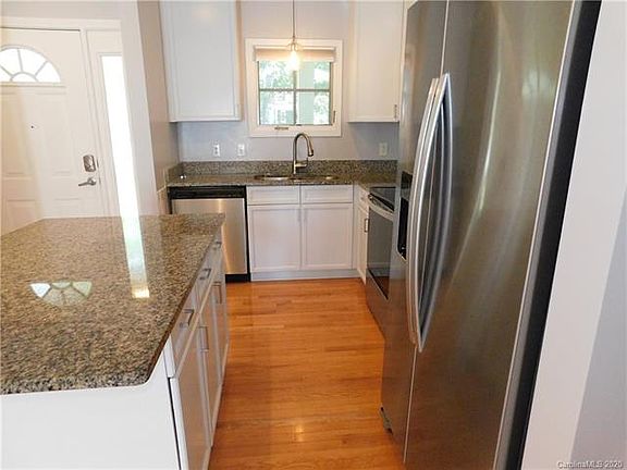 Great townhouse in Wesley Heights: 2 bed 2.5 bath, open floor plan, fireplace and hardwood floors on main with french doors to balcony. Extended length rear entry garage and separate rear entrance. 1 designated parking spot in addition to garage and on-street parking. Rent includes water, Partial views of Charlotte skyline, walking distance to greenway, Panther Stadium and restaurants.