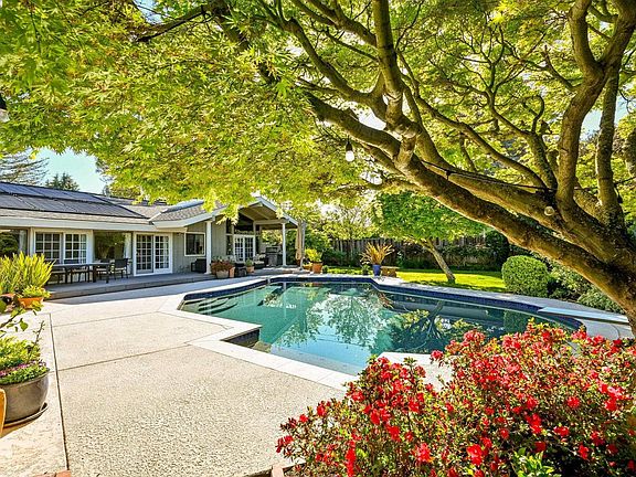 Prepare to be impressed by this 4 bedroom, 2.5 bathroom, single-story custom home serenely situated in a tranquil cul-de-sac. Inside this light-filled design you’ll find soaring vaulted ceilings, skylights and multiple sets of French doors filling the home with abundant natural light. Welcome guests into your spacious living room boasting a cozy fireplace and large picture windows. Gather formally in the dining room showcasing stunning views of the backyard’s lush garden, expansive entertainment deck and recently upgraded pool. Drift into the heart of the home’s kitchen complete with a center island and dining area perfect for casual meals. The kitchen flows effortlessly into another major living area including a 2nd fireplace, built-in shelving and more windows beckoning you to explore the outdoors. 3 generously sized bedrooms in addition to the peaceful primary suite, laundry room, 2 car garage plus bonus storage area complete the interior of this exceptional home. With nearly $100K in recent upgrades and proximity to esteemed schools, nearby shopping, parks, trails and transit options, 733 Mandarin Lane embodies modern living at its finest.
