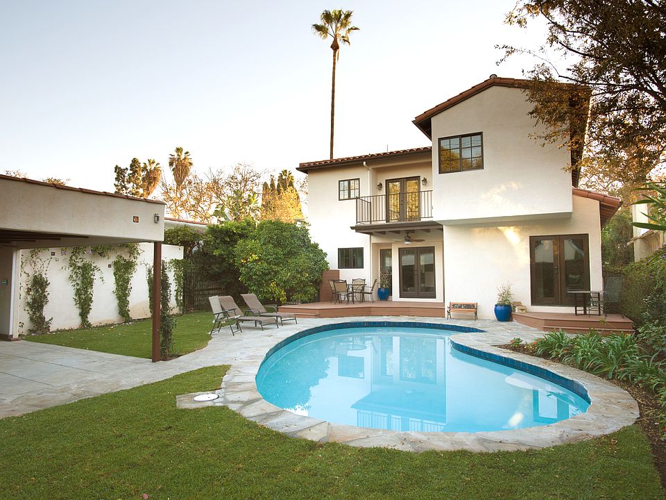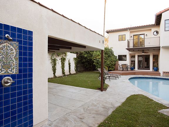 This newer built Spanish beauty offers all the comforts in a home. A welcoming flow from the moment you open the door looking into the spacious living rm through the kitchen area & out to the large private backyard. The welcoming living rm is spacious w/ curved arch ways & oak flooring throughout. The custom kitchen offers plenty of work space on the gleaming white counter tops, center island w/ enough storage in the custom cabinets, high tech power outlets for all your electronic needs, wine refrigerator, & newer S/S appliances. Wonderful family rm w/ access to the backyard. Lower bedroom suite + powder rm. Upstairs has 2 generous size bedroom suites & the primary bedroom that offers great closets & a custom bathroom that includes dual sinks, a separate oversized shower, & a soaking tub all overlooking the amazing backyard with sparkling pool. There is a cabana for shaded enjoyment with a bath w/ an outdoor shower to complete the So Cal living experience. Walk score of 83.