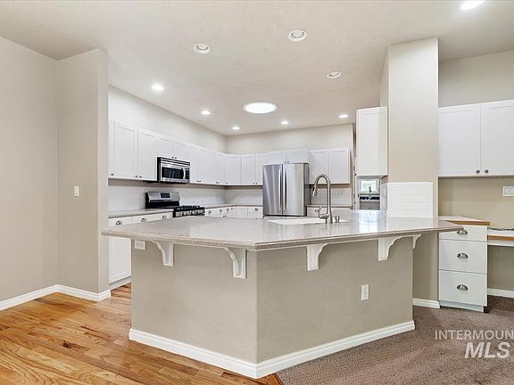 You will not find a more beautifully maintained 3 bedroom home at this price in Kuna. Large open kitchen with tons of storage, corian countertops, and beautiful real hardwood floors that continue from the entry all the way through the dining room. All three bedrooms are roomy with the Primary Suite boasting tons of natural light, separate shower and soaker tub plus dual vanities. Tasteful touches throughout the home from the custom paint colors and window treatments to the tiled bathroom floors. Step out into the enclosed back porch, the covered patio and perfectly landscaped backyard. A 3-car tandem garage with built-in workbench and the park around the corner, all in a great subdivision. Get moved in before the holidays and start making memories!