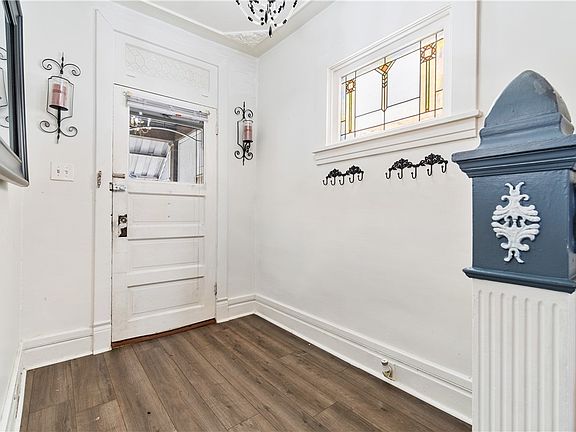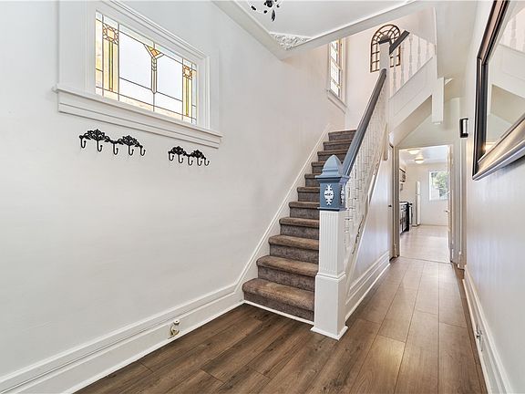 This lovely 3 bedroom home *could be* a 4 bedroom with a little TLC to the walk-up attic. This home boasts spacious room sizes, tall ceilings, and original crown molding. Newer laminate flooring, built-in shelves in the dining room along with a wood burning stove. This home has tons of character with beautiful details like the intricacy of the wood staircase in the entryway and several stained glass windows throughout the home. Kitchen has plenty of cabinets, counterspace and an area toward the back with room for a small table by the window. Mud room off of kitchen could be used as an area for coats and shoes or a large pantry area...or both! Nice sized bedrooms with lots of closet space and a lovely hand-painted mountain mural in the second bedroom. Covered patio in backyard is the perfect cozy spot to enjoy a glass of wine or a morning cup of coffee. Detached 2 car garage with alley access has new garage doors and an automatic opener. New HVAC system 2020.