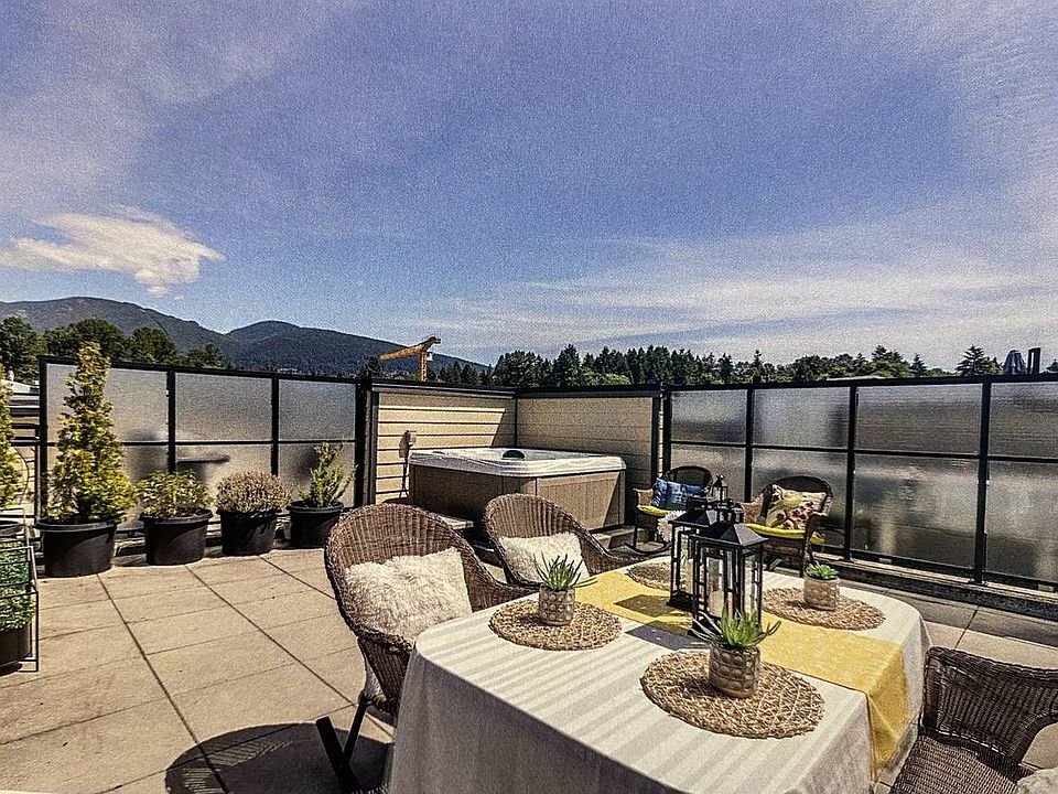 This amazing penthouse with huge private rooftop with hot tub can be your next home! Enjoy luxury living in this modern and well-located place in the heart of North Vancouver. Large windows bring a lot of natural light to this open concept 2 bdr 2 bth penthouse, equipped with top-notch stainless steel appliances and luxe tiger skin granite on countertops, backsplash and island, chic cabinetry, and full-size wash and dryer. A marble fireplace in a bright living room facing SW with a great BBQ deck right off the main level. The Master bedroom is spacious enough for a king-size bed (see picture) and features an electric fireplace, a private washroom with an walk-in shower, and a closet. Radiant in-floor heat controlled by Nest system and wifi outlets make your life easy by controlling lights and temperature on your smartphone or Alexa. Relax in this architecturally designed home that features a 360-degree view that includes Grouse Mountain on a 495 sq ft spectacular rooftop patio with a hot tub. The building has a completely well-equipped gym and a chic foyer. Your car will be warm and free of snow as this unit has an underground garage, and you can store all your seasonal belongings in a big and secure storage downstairs. Leave your car at home and enjoy 4 grocery stores, malls, restaurants, Moskito Creek and Mahon Park, and a bus stop steps away. Easy access to Highway 1, West Vancouver, Downtown Vancouver, and Seabus. Heating and Water/hot water are already included. Westview Elementary (700m away) and Carson Graham Secondary School (1.6km away) catchment. Pets upon approval. No smoking. Electricity and internet payed by renter. $2000 pet deposit.