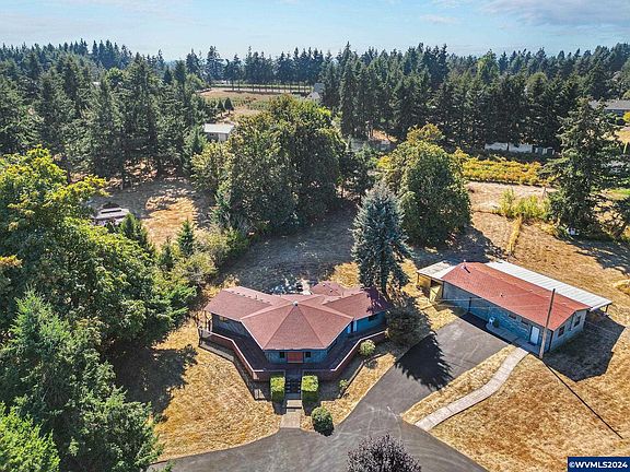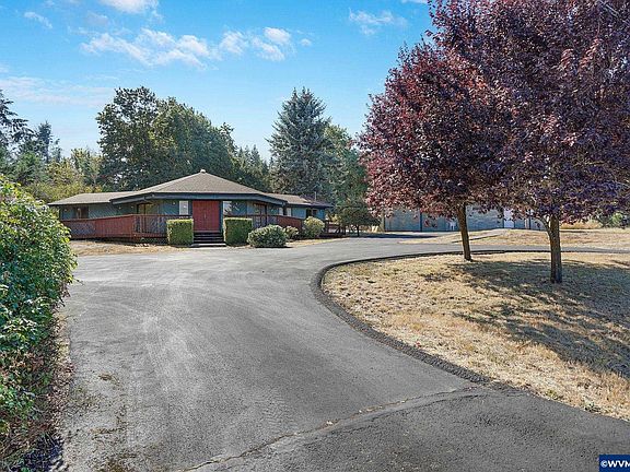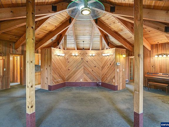Lodge-type custom home on two flat acres in the Cascade School District! Hexagonal shaped center with handsome exposed beams frame the great room and kitchen with separate wings for primary and guest bedrooms. Ample storage and every room has outside access. Shop with 220v includes a rec room with its own bthrm/ADU potential and gardening and machine shed portions that open up to flat pasture for hobby farm potential. Asphalt circular-driveway and parking. Close to Hwy 22 and minutes from Salem.