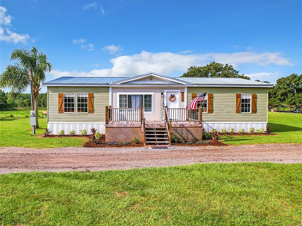 Nestled upon just under 1 acre of land, this well-maintained and beautifully designed modern mobile home built in 2007 offers a haven of tranquility and comfort. The gated home has a fully fenced yard, gravel driveway along with a separate run for livestock. Step inside to discover a spacious and open floor plan that seamlessly connects the living, dining, and large kitchen areas. Imagine your mornings looking thru your kitchen window to see cattle grazing in the pasture. Laminated flooring throughout. 4 Split Plan bedrooms. 2 Bathrooms, Interior Laundry Room/Mud room. HVAC 2020, Septic 2021. New siding and skirting. The sturdy metal roof 2021 is not only visually appealing but also durable, ensuring protection from the elements. The back of the home faces the neighbors open 20 acre lot, so sit on the 2022 decking which provides an ideal space to entertain or bask in the soothing natural surroundings while enjoying picturesque pastoral views of wildlife, cattle and nature. Prepare to embrace the tranquil country life.