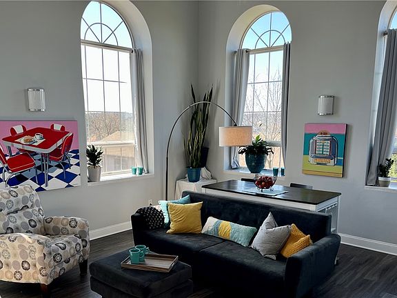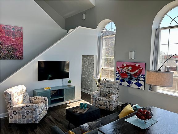 School House Condo, Must see multi level condo with 12 ft ceilings that soar to 20 ft in living area that includes two bedrooms and two baths. This rear quiet corner unit is sun filled with gorgeous arched windows and a second story loft with private bathroom that has a view of Kennywood coasters through one of the dormer windows. Large open floor plan for main living area that includes fully equipped kitchen with ample cabinet space and stainless steel appliances. Additionally, there is a space under the steps for an office, plus a small room that can be used as office or large pantry, and in-unit laundry. Condo comes with assigned parking (spot R), additional storage in basement common area, close to parkway and shopping , plus EZ trip to the city and universities. Walking distance to Frick Park, Regent Sq, Edgewood Town Center, bike paths, and many other attractions. HOA and residents are currently working on plans for landscaping and outdoor space. Come check out this unique condo!