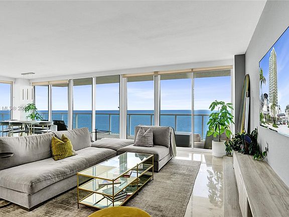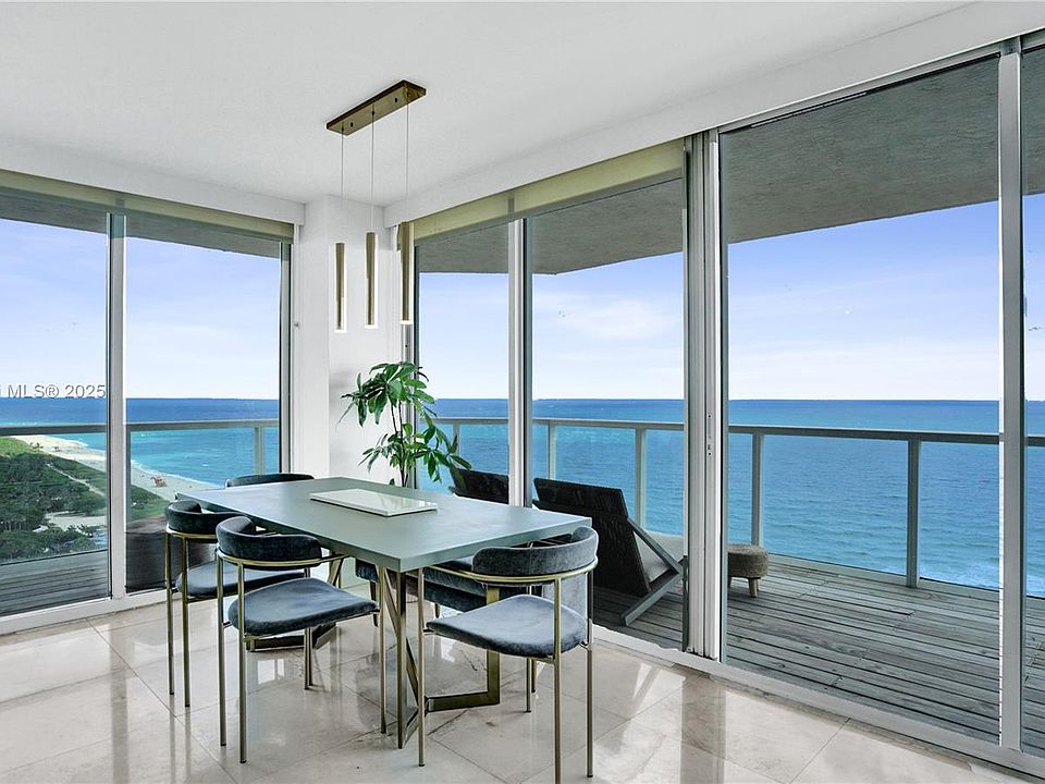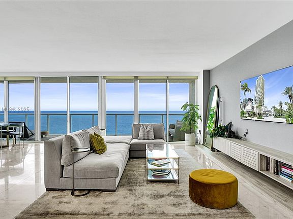 Corner residenceWaterfall islandDirect ocean ne cornerFloor-to-ceiling glassMarble tilesCustom cabinetryStunning ocean-to-bay views