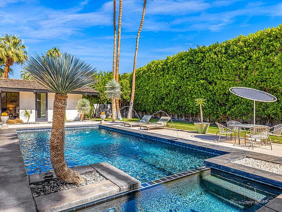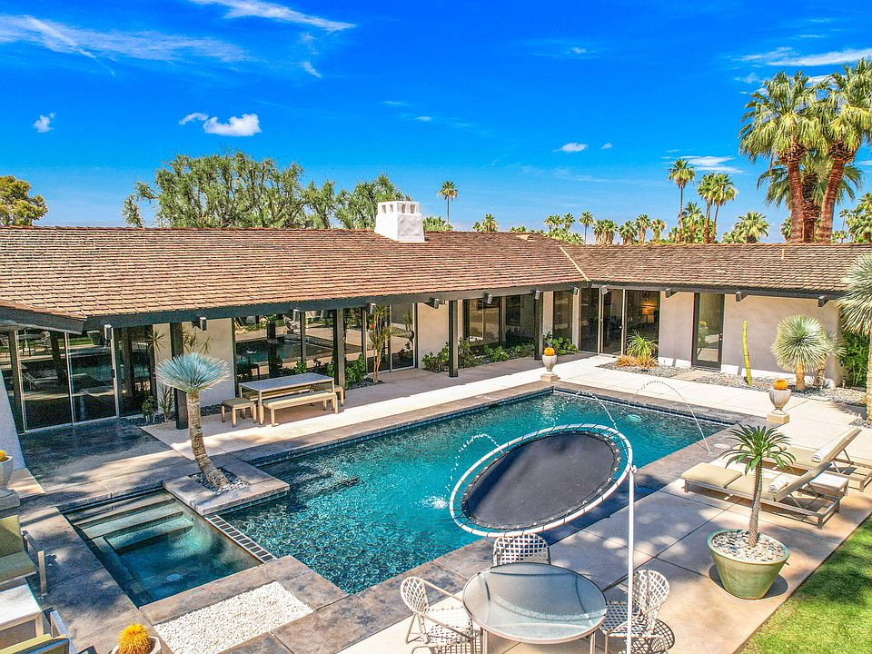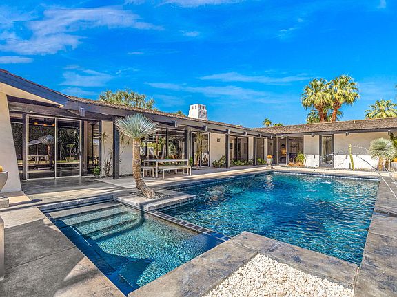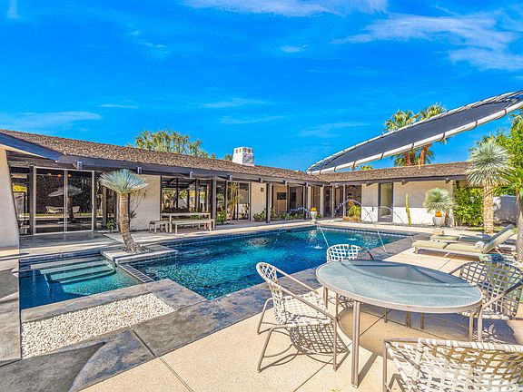 Midcentury post-and-beam! Since 1965, only three families have served as stewards. Architecture firm Patten + Wild also designed Frank Sinatra's Villa Maggio. Walled + gated with a circular driveway and true to its original design. This property enjoys a nice, elevated separation from the street. The wood shake roof overhang is noteworthy creating shaded areas and architectural interest. Living and dining areas speak to the sophistication of that era. Walls of glass, plus vaulted + beamed ceilings encourage the eye to travel throughout this 3,883 SF home. Flawless Brazilian slate sets the modernist tone. Island-centric kitchen plays well with so much natural light. Black plaster pool + spa scale nicely for such a setting. Noteworthy are the many patios. Heading inside, the primary bedroom is configured with two upgraded bathrooms, walk-in closets, and views to the pool. A former guest room has been converted into a media room. Guest suites #2 and #3 are positioned on opposite ends of the home with access to respective patios. Garage features direct access. Talking big picture, this is a RARE opportunity. A home to be LOVED for years to come. Enjoy it all.