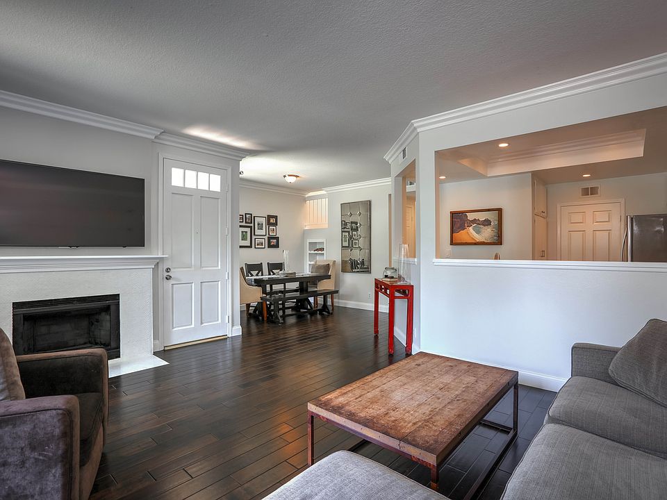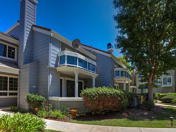Beautifully upgraded Pacific Ranch Condo. This is a 2 story Villa which is hard to find in Pacific Ranch. Dark hardwood flooring throughout, new interior paint, new resurfaced showers in bathrooms, Custom fireplace and mantle, and newly painted exterior. Large patio off living room, laundry room inside, with half bath downstairs and 2 full Bedrooms and Baths upstairs. This home is move in ready and shows like a model. This is an amazing end unit facing beautiful greenbelt. You'll feel like your at a resort!