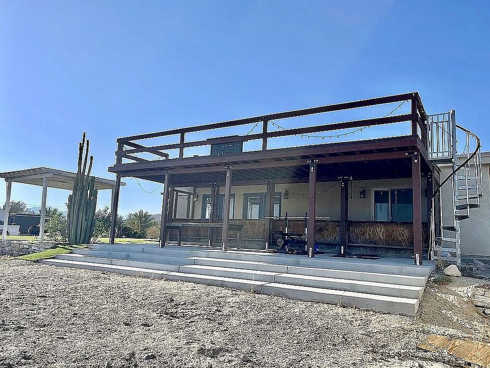 Escape the city and enjoy serene, private living on this gorgeous 2.5-acre property featuring over 65 Medjool Date trees with room to plant many more. Zoned for agriculture and equestrian use, this secluded retreat offers spectacular mountain and desert vistas, perfect for appreciating stunning sunsets, sunrises, and starry nights in peace. The charming, furnished 4-bedroom, 1-bath Sky Valley home boasts a European kitchen with white and gray granite countertops, Old World cabinetry, and spacious dining area. The bathroom features a high vanity with a glass bowl sink and an open tile shower. The living room is warm and inviting, with French doors and a real wood-burning stove, complemented by a spacious 6’ x 40’ screened-in porch for outdoor relaxation. A fourth bedroom on the west side of the home provides additional flexibility. Outside, the property includes a trailer for a project ideal for guests, a caretaker, or in-law quarters as well as four sheds for storage. For entertainment and gatherings there is 20’x40’ concrete slab on the lower part of the property offers versatile space for additional projects or structures. The home is partially gated for privacy and features a covered carport, making it perfect for families, artists, musicians, or contractors seeking a peaceful rural lifestyle. This property offers a unique blend of natural beauty, functional living spaces, and agricultural potential, or just a private getaway for those seeking a weekend home