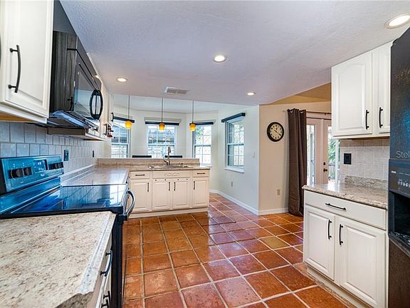 What a great location! This 3 bedroom, 2 bath, 2 car garage pool home with spa is located in the community of Nature's Hideaway. The home is on a large corner lot with mature landscaping. There is no carpet in the home. The main flooring is Santillo tile & all bedrooms are wood laminate. As you enter the home you are welcomed into the living / dining room with a wood burning fireplace. This home is a 2 way split. Master bedroom has its own en suite with beautiful walk-in shower & large walk-in closet with organization. The French Doors will lead you out to the pool. Bedrooms 2 & 3 are a nice size. In between them is the stunning secondary bath. The kitchen has solid wood cabinets & a large stainless steel farm sink. All kitchen appliances come with the home as do the washer & dryer! The yard is fully fenced and has a screened patio to enjoy the great Florida weather. There is a solar cover for the pool for year round enjoyment. The home is close to the beaches, great schools & shopping. The New Port Richey / Trinity area continues to grow & be a great place to own a home! Call for your private showing today!