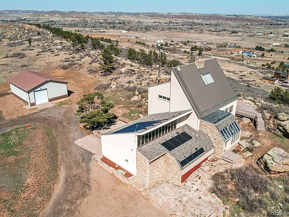 Welcome to this custom-built split-level home on a 95-acre lot.This estate offers a rare blend of architectural elegance, thoughtful design, breathtaking views & cutting-edge sustainability.As you enter, you're greeted by a rock garden with drought-tolerant plants & an indoor spigot for ease of care. The main level is full of natural light & incredible views.The living room features SMARTCORE vinyl flooring, a vaulted ceiling, fireplace, & a charming built-in doghouse under the stairs.Whether you prefer a dedicated formal dining area or an extended living space, the open floor plan offers many possibilities. The kitchen has granite countertops, 2-way fireplace, dual sinks with disposals, an island & a large pantry. On the main level, you'll find a full bathroom & a bedroom. The upper level has a loft open to the living area below & leads to the primary suite.This luxurious suite offers a fireplace, wood accent wall & an unforgettable 5-piece en-suite bath. Highlights include 2 walk-in closets, a freestanding red clawfoot tub, a private balcony, vanity area & barn-door linen closets. The lower level offers a family room with new carpet & tile by the fireplace, a wet bar, 2 additional bedrooms, a ¾ bath & a private office which could be converted into a 5th bedroom.The utility room includes a washer/dryer, utility sink & access to the garage.The oversized tandem-style garage fits 4 cars & an RV, or up to 6 cars total. Additional storage space is available on the main level & in the loft.The deck has a hot tub (included) & an enclosed sunroom. The workshop is approx. 2,400 sqft with a large garage door & loft. Sustainability meets innovation with the Timberline Solar Roofing System—the first of its kind installed in Larimer County—where solar shingles integrated with traditional roofing materials. The property includes an income-generating internet tower, producing approx. $1,400/month. Don’t miss your chance to own this rare & remarkable piece of Loveland real estate.