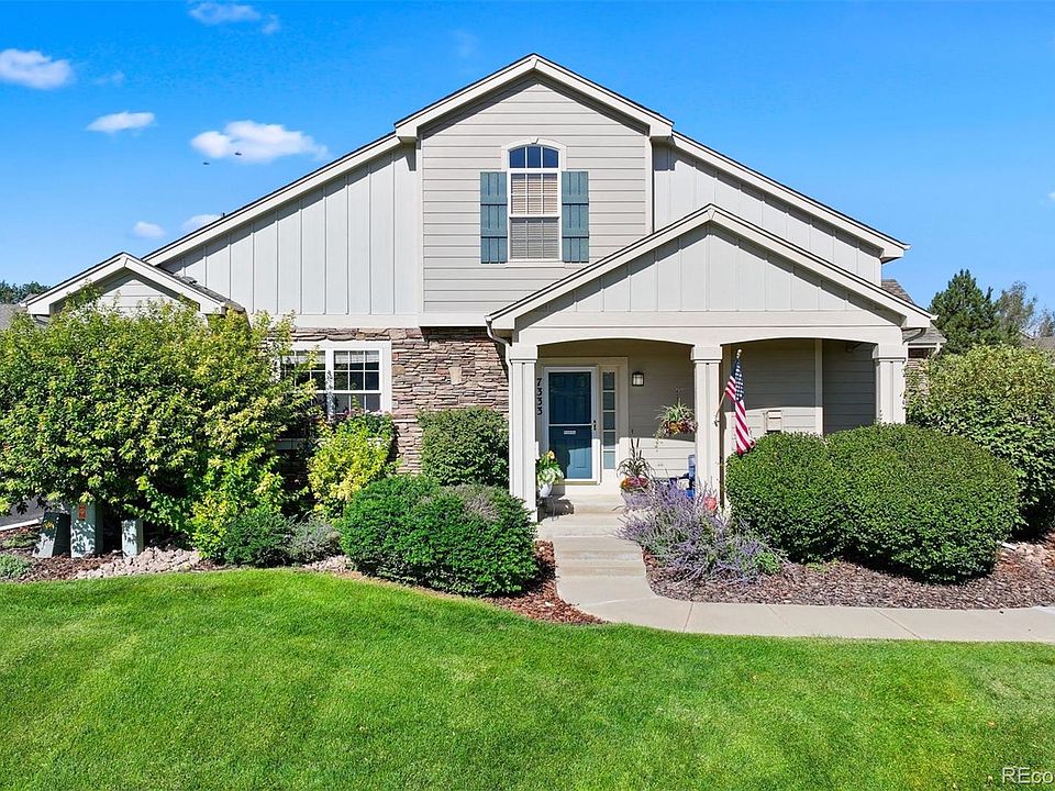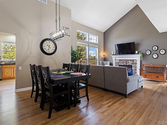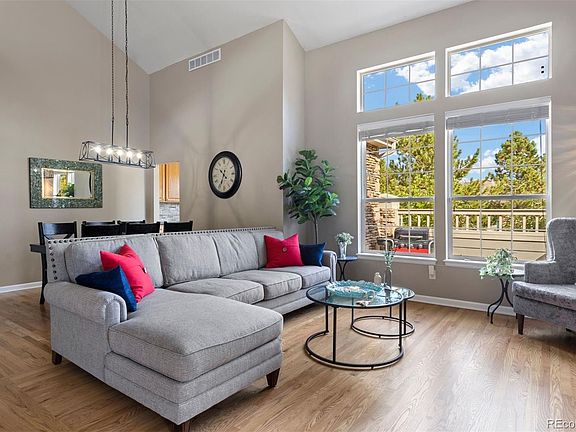 Tucked into the heart of Castle Pines North, this end unit townhome is surrounded by mature trees and beautiful landscaping, enhancing the privacy and peacefulness of the home. Centered around a stunning great room with 2-story ceilings, fireplace, hardwood floors, and abundant natural light, the living spaces flow into a generous dining area and kitchen, featuring new LG stainless steel appliances and sliding glass door opening to a serene patio. Unwind in the spacious main-floor primary suite, which includes dual closets and a 5-piece bathroom. The main level also features a second ensuite bedroom with a large walk-in closet, while a spacious loft upstairs overlooking the great room is perfect for a home office or extra bedroom space. The lower level is finished and offers extra space to spread out with a multi-purpose rec room and third bedroom. With views across green spaces and walking trails and glimpses of wildlife, this home offers the perfect escape from the hustle of the city, while only being 15 minutes from Denver Tech Center.