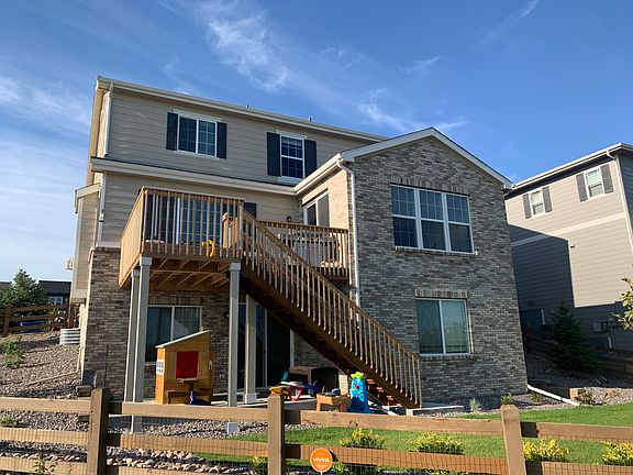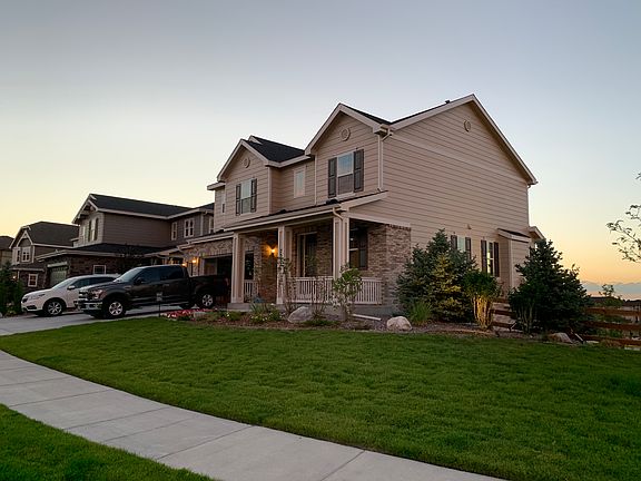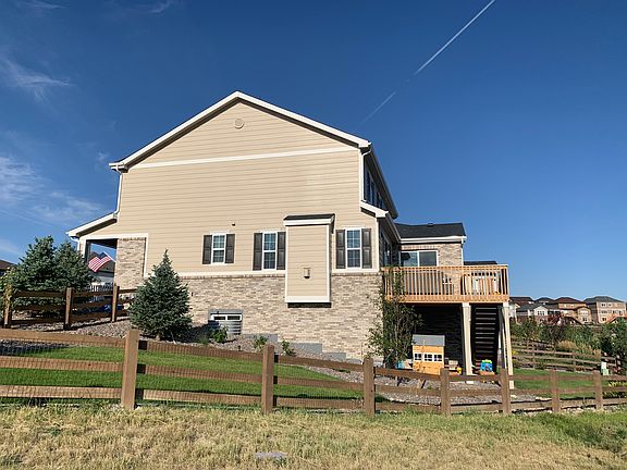 This very popular Twain is on a 9500 sq ft. corner lot. Beautiful interior finishes, tile flooring throughout the main floor, sunroom, gourmet kitchen, finished basement on a great walk out lot in our Hillcrest neighborhood. This former model boasts beautiful interior finishes, finished basement with 5 bedrooms, 3 1/2 bathrooms, study and sunroom. You will have great views from your back deck looking over a park and pond. Walking distance to all three Cherry Creek Schools, community parks, Aurora Reservoir and Shopping. Rear landscaping and all fencing included.