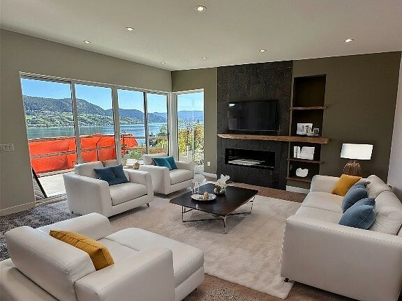 *AIR B&B/SUITE* Welcome to Lakeview Par 5 in Vernon's Bella Vista neighbourhood. Discover a collection of five masterfully designed residences, carefully curated on this gently sloping terrain handpicked for its exclusivity. Unit #2, gracefully positioned at the heart of the triplex, invites you in with its natural quartzite accents seamlessly blending the outdoors with the indoors. In the foyer you are greeted by the terazzo polished concrete flooring which is found throughout the home. On the main floor, enter the primary bedroom with panoramic Lakeview, four piece ensuite with custom tiled walls, soaker tub and large walk in shower. The floating riser staircase with structural glass screen wall guides you to the top floor living area with gourmet kitchen adorning quartz and quartzite counter tops, gas stove and imported euro line high gloss cabinetry, two additional bedrooms, living room and guest bathroom. Over the fireplace find a custom live edge mantle made from elm harvested from the property. The space, adorned with light through huge picture windows and overside sliding doors which lead to an expansive sand finished concrete patio with towering lam beams and glass railing providing unobstructed breathtaking views of Okanagan Lake. The lower level offers tremendous opportunity for rental suite or Air B&B (potential for $3000+/mnth income). Complete with media room (with kitchenette), 4th bedroom, bathroom, ample flex space and second entrance. GST is applicable.