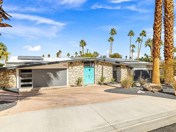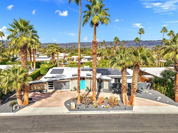 An authentic Charles Du Bois masterpiece, one of just 47 in Purple Hills Estates, this mid-century gem is near El Paseo in South Palm Desert. Built in 1962 on a generous 13,504 sq ft lot, it exudes both history and modern luxury. Enjoy a fully paid solar system, new 2024 roof, water filtration and softening systems, and fresh interior/exterior paint. Solid oak double doors reveal bamboo plank flooring with matching bamboo-glass door accents, while newer cabinets blend retro style with modern convenience. Outside, discover a desert haven with mature trees, drip irrigation, an iconic oval pool, a courtyard fountain, a turquoise gate, and a chic circle driveway. The backyard offers Alumawood pergola covers, perfect for relaxing or hosting at the BBQ bar with fridge and sink. Unwind by the fireplace or from the misted gazebo with mountain views. Marvel at the cantilevered backyard steps, designed with purposeful style. Perfectly preserved yet updated, this 3BR/2BA is a rare piece of Palm Desert history, seamlessly merging vintage flair with contemporary comforts. Own an iconic slice of 1960s innovation in Southern California's mid-century modern mecca. Seize this chance to live in true Du Bois style every day. Schedule your private tour and step into timeless mid-century elegance.