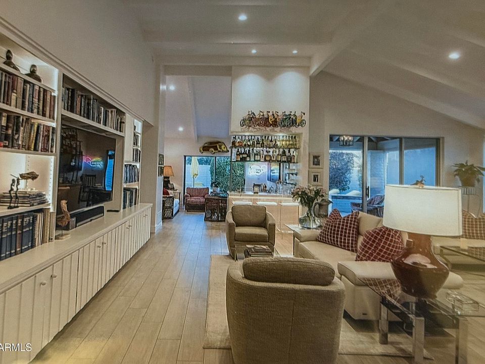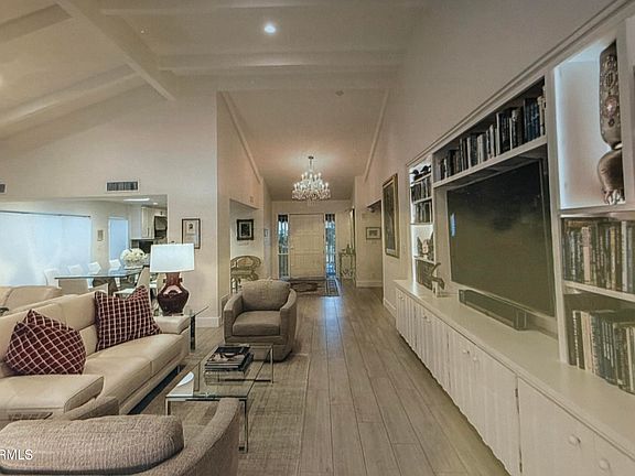 Gorgeous Remodel / Updating in 2017 to the nth degree; ceilings raised, walls removed, kitchen expanded, new wide plank porcelain ''oak'' flooring, dual ovens, warming drawer, microwave, sub-zero refrigerator, under cabinet/interior-cabinet lighting, quartz countertops, ample storage, open floorplan with natural light, built-in cabinetry with custom lighting, separate custom lit ''lounge'' with full bar facilities, icemaker, refrigerated wine storage, custom lucite ''spirits'' display shelving w/ custom lighting, full custom roller shades on exterior windows. Primary Bedroom w/ custom built-ins, dual closets, custom shower. Secondary Bdrm w/ skylight currently used as office; Tertiary Bdrm w/ vaulted ceiling used as 2ndary office w/ adjacent bath. True ''community feel'' neighborhood!''