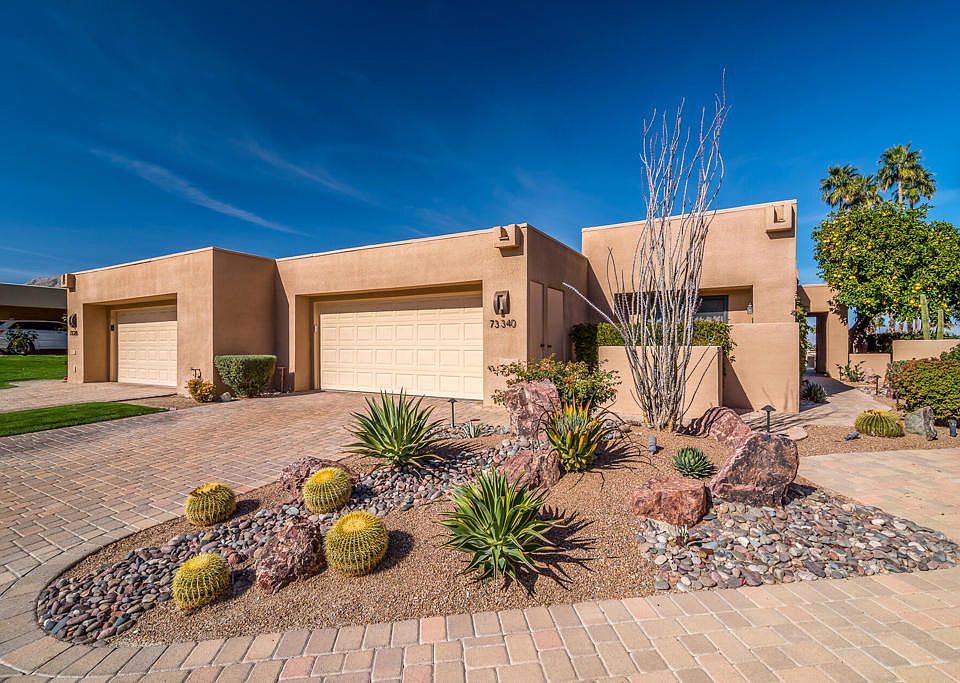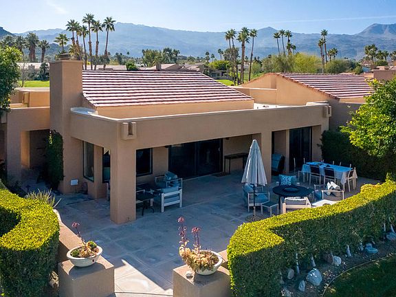 This may be the perfect Ironwood CC Villa with wonderful outdoor living patio space and gorgeous views, right in the center of the community near the tennis clubhouse and very close to the golf Clubhouse and just steps from a Pool and Spa! This home has been recently remodeled with a beautiful kitchen featuring granite counters, white stylish cabinets, stainless appliances, beautiful backsplash treatments and a charming dining nook. The two bedrooms, two baths have been beautifully remodeled with elegant shower and sink appointments. The exceptional elevated outdoor patio with views of the local mountains is a perfect place to entertain or just watch the colors of the desert scape change with every sunset or sunrise. All outdoor furniture is included, the yard has 2 grapefruit trees that produce frequently. Every detail has been considered, including a completely finished oversized 2 car garage with a mini split A/C system, completely insulated ceiling and high-end cabinet storage. Located in Ironwood Country Club which features 36 holes of Championship golf, Tennis and social opportunities await. Available separately with Club membership.