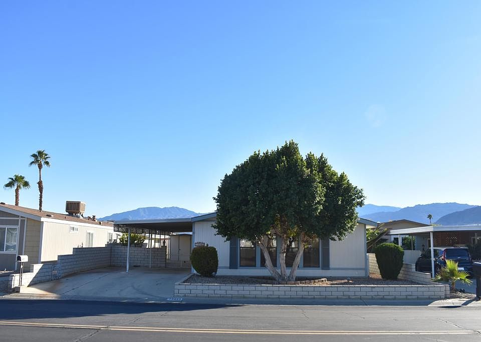 This Manufactured home offers an open floor plan with 1,680 sq ft, 2 bedrooms, 2 baths, dining area, living room, kitchen and full laundry room. Living room has large windows looking out to mountain views. Kitchen has a breakfast bar and opens to the living area. Primary bathroom features: dual vanity, walk in shower and soaking tub. Low monthly HOA of $326.00 includes club house, golf, trash and cable. Palm Desert Greens Community activities include fitness, tennis, pickle ball, bocci ball, shuffleboard, card clubs, computer club, library and more. Guarded gated community with 24-hour patrol. You own the land!