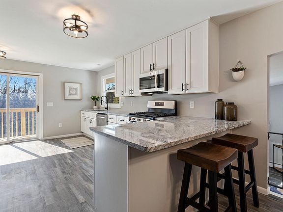 Here is your rare opportunity to own an affordable acreage home in Woodbury! This beautifully remodeled 4+ bedroom home sits on 1 acre of trees and privacy. Features include a huge kitchen that has been remodeled from top to bottom. Custom tall cabinetry, soft close drawers, crown molding, granite countertops with undermounted sink, stainless steel appliances and much more. Updated lighting, flooring and paint throughout. Both bathrooms have been completely renovated and are gorgeous! Brand new windows. The newly finished sunny 3 season porch could easily be turned into a 4 season, and has walls of windows! Vaulted main floor family room with brick fireplace. Plus, now there is a fully finished walk out basement with recessed lighting added everywhere, huge recreation room, 4th bedroom, den, and large utility /storage room. Boiler and water heater are also newer. East Ridge schools. Seller is also including a new $40,000 septic system. You will love the sunny, open feel of this home!