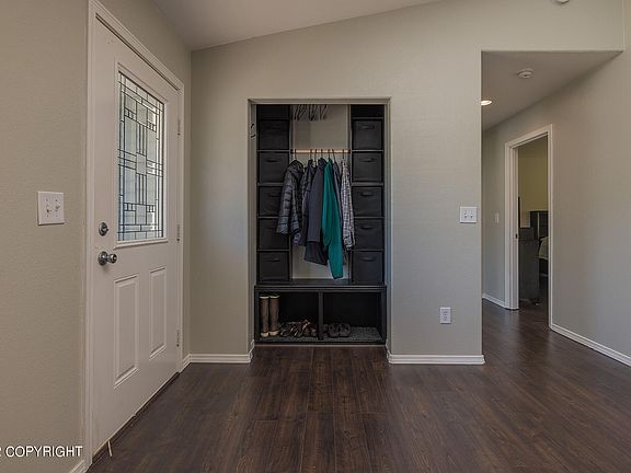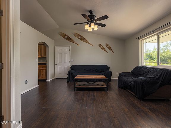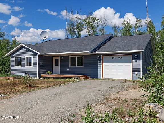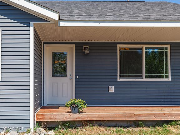 Updated 2 bedroom ranch home situated on an acre! Brand new laminate wood plank floors and neutral paint colors throughout! Large family room with great natural light and vaulted ceilings. Eat in Kitchen with tons of storage, stainless steel appliances & beautiful cabinets. Both bedrooms are HUGE! Primary bedroom has ensuite bathroom. The oversized one car garage has a storage closet & man door.Plenty of room for parking you Alaksa toys! Front and back porch are both covered and the backyard is fully fenced. Lot backs up to a large wooded parcel for privacy.