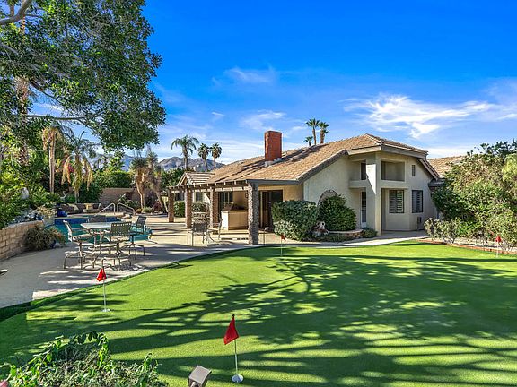 Desirable Canyon Cove in South Palm Desert with no HOA fees! Leisure backs to the south on an oversized lot (13,068 sq. ft.) with mature landscaping, a gorgeous private pool & spa, large artificial putting green as well as artificial turf in the front and backyards. Sought-after floor plan offers formal living and dining rooms, separate family room, eat-in kitchen, 4 bedrooms and 3 baths. Features include shutters, 3 car garage with work area, built-ins, wet bar, built-in BBQ and an enclosed backyard.