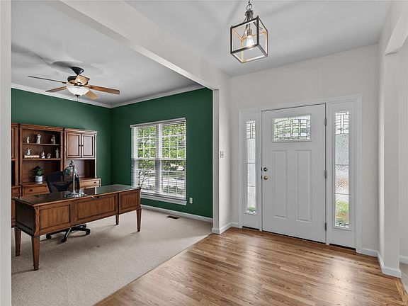 STUNNING 2-story with almost 4000 sq ft, immaculately maintained, with FINISHED WALKOUT lower level & OVERSIZED 3-CAR garage. Elegant curb appeal with COVERED PORCH & all-season landscaping. Short walk to Aberdeen POOL & scenic lakes. Open plan with 9-FT HIGH CEILINGS & hardwood floors in foyer/kitchen/breakfast room. Front office & formal dining room. Great room WALL OF WINDOWS & ventless gas fireplace. Chef's kitchen with 42" CABINETS, large center island, QUARTZ counters, updated lighting, STAINLESS APPLIANCES (refrigerator stays) & storage pantry. Breakfast room bay steps out to MASSIVE COMPOSITE DECK overlooking backyard. Upstairs owners suite with dual vanity, soaking tub & separate shower. ALL bedrooms feature WALK-IN CLOSETS! 2nd bedroom suite, plus other bedrooms share double-sided bath. Downstairs rec room with high ceilings, recessed lights & walkout. Full bath, home gym & generous storage. SEE FEATURES SHEET! Just 3 minutes to Hwy 364 in AWARD-WINNING SCHOOL DISTRICT.