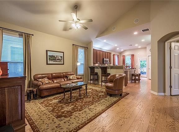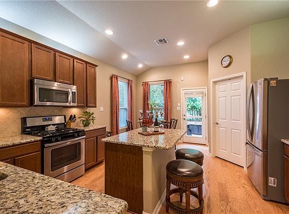 This amazingly upgraded and maintained single story home sits on a premium lot. Features include open kitchen, stainless steel, all granite counter tops with center island, Whirlpool appliances, ceiling fans in bedrooms, study and living room. Master bath has walk-in shower. One of the bedrooms could be an office. Wired for surround sound. Custom patio with fire table and rock columns, wired for TV with outside speakers. Backs to greenbelt with great trees. HOA covers exterior irrigation, landscaping.