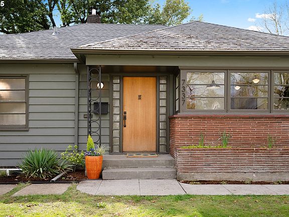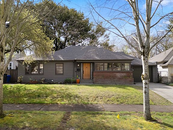 This Unique 1940s Mock Crest Ranch boasts distinctive rounded walls and an abundance of windows, making it a true Midcentury gem. Step inside to find beautifully refinished hardwood floors that lead to the spacious living and dining area featuring a gas fireplace with a distinctive 40s mantle & marble tile surround. Wooden French doors open onto a expansive deck overlooking a private, oversized backyard complete with a hot tub, raised beds and a Bay Leaf tree over 100 years old. The kitchen blends modern updates with retro charm, offering new quartz countertops, a brand-new fridge and range and a cozy eat-in booth. The main level floor plan has a great flow and includes three bedrooms (one with bunk beds!) and a full bath, while the lower level provides a fourth bedroom and a generous family room — perfect for flexible living. Just one block from the scenic Willamette Bluff, this home offers easy access to walking, running, and biking trails, nearby parks, Arbor Lodge amenities and friendly neighbors! [Home Energy Score = 2. HES Report at https://rpt.greenbuildingregistry.com/hes/OR10236024]