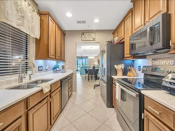 Step into a bright and inviting living space where high ceilings amplify the sense of openness and tranquility. Elegant mirrored walls reflect the natural light streaming through the large patio door, creating a luminous and uplifting atmosphere. Relax in your own private patio retreat with peaceful water views ideal for savoring your morning coffee or unwinding at sunset. The serene water view continues into the master suite upstairs, offering a calming start to each day. The galley-style kitchen is both stylish and functional, featuring stunning quartz countertops and brand-new appliances.