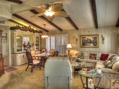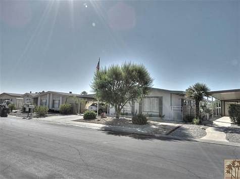 Oasis in the desert with beauty & charm. From the well designed curb appeal to the patio & lanai you have a feeling of being on an island enjoying the quiet surroundings with beautiful flowers. Then quietly listen to the bubbling water fountain & the soft buzz of humming birds that keep you company. Turning away, you enter the front door to a very light & bright large living room accompanied with wooden shutters and newer carpeting. A very attractive dining area is conveniently located just off the kitchen where you will find an electric, free standing stove and a built-in microwave. The upgraded quartz stone kitchen counters match the newer laminate wood flooring in the kitchen & den. Then make your way into the master bedroom with its wall-to-wall mirrored closet doors and its ensuite master bath housing a beautiful walk-in open tiled shower. Corian covers the double lavatory counter top & the floor is matched with the shower tile. On permanent foundation!!!!!