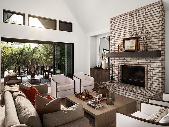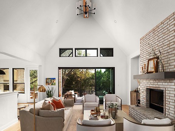 - Description: The living room features a striking floor-to-ceiling brick fireplace with a vaulted ceiling that enhances the sense of space and light. A gas-start, wood-burning fireplace adds warmth and character, while the open layout flows seamlessly into the kitchen. Expansive black sliding doors open to the back porch, creating effortless indoor-outdoor living, all set over beautiful white oak wood floors.