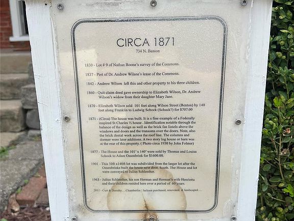 THIS RENOVATED HISTORIC HOME features 10' ceilings, what appears to be original trim and casing, and a beautiful brick exterior. Kitchen has tile flooring, 42" Maple cabinets, center island, built-in desk and plenty of counter space. Large dining room, main floor laundry, full bathroom, and a large living room are all on the same floor. The covered deck is a perfect spot to relax and enjoy the yard. Upstairs you will find the master bedroom suite with full bath plus a 2nd Bedroom. Seller has added new flooring, updated the counters and appliances and, fresh paint and new soaking tub. Large level yard great for family gatherings. The backyard is partially fenced, this is a corner lot. Check out the history on the plaque outside. Walking distance to historic downtown St. Charles Main Street. Frontier Park is the home of many special events throughout the year hosted by local organizations. If you are wanting history and charm in St. Charles you have found you next home!