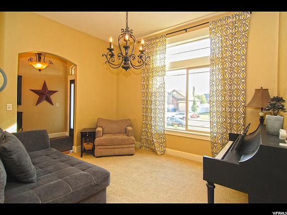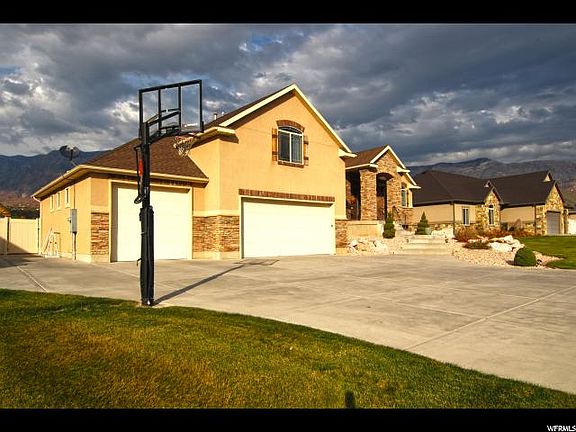 This gorgeous custom built home with 5 bedrooms, 3 bathrooms and a (FOUR) car garage is a show stopper. It sits on a quarter of an acre lot. The open concept floor plan flows perfectly from the formal living room to the open family room and kitchen area. The large windows display a majestic view of Ben Lomond Peak and with an open field behind there is nothing to spoil that view. The beautiful kitchen features custom cabinetry with a full walk in pantry, solid hardwood floors, gas range, hidden spice racks, an over sized granite counter top and a semi-formal dining area. The main level master suite features a separate shower/tub with travertine floor and shower and a large walk in closet. Main level living room, master and bonus room has brand new carpet installed a year ago. The second level features a large bonus room above the garage with custom built in tv shelving. This area is perfect for a play room, tv room or an additional living space with the closet. The walk out basement features a large theater room, exercise room, den and office and two additional storage rooms. There is also a separate entrance into the garage through the basement which is great for bringing in food to the cold storage room or moving in furniture. The home has two hot water heaters and a water softener. The main floor laundry has plenty of drawers and cabinets for storage and currently has a stackable washer/dryer, however, the home is originally plumbed for a side by side washer/dryer if desired.