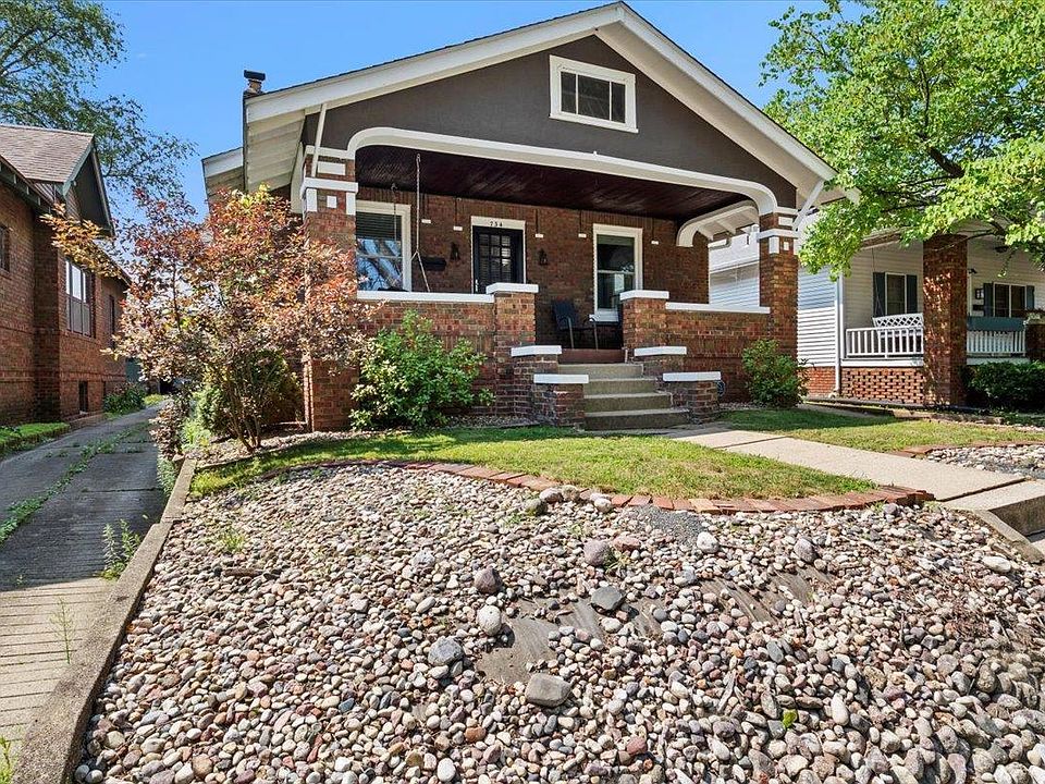Relax on the front porch swing of a beautiful brick bungalow within walking distance to Washington Park. This move-in ready home features built-in bookshelves, a wood burning fireplace, crown molding, stainless steel appliances, a breakfast bar, a large master bedroom with two closets, beautiful hardwood floors, heated tile flooring in bathroom, a full basement, and a fenced back yard with firepit. Updates include 14 new windows, blinds/window coverings throughout, bathroom vanity and lighting, back exterior door, stepping stones with fabulous patio and grill pad, an Adobe Security System with sensors to entry doors and windows with smoke detector monitoring, a Chamberlain myQ Smart Garage Door Opener, a Flo by Moen Smart Leak Detector with shut off and three leak sensors, and a Smart Thermostat by Ecobee.