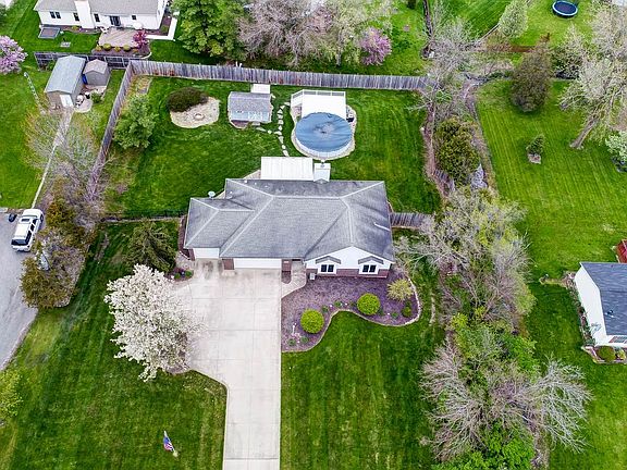Ranch situated on almost a acre with full finished daylight basement. Great room with vaulted ceiling and gas fireplace, kitchen with breakfast bar and dining area with ceramic tile flooring, 3 bedrooms with 3.5 baths with separate laundry room 6 x 6 with the half bath, Daylight basement with 9 ft. ceilings, 16 x 34 Rec Room, 14 x 28 exercise or play room with full bath that is sharp with nice ceramic tiling. Beautiful quaint wet bar with entertainment area. Also shuffleboard table remains to start the collection of fun activities to do in the basement. Lots of storage. Solid Six Panel doors and Anderson windows. 35 x 21 Three car garage with openers. Private backyard with above ground swimming pool with vinyl 12 x 20 deck. Great fenced in yard. 90 Plus gas forced air furnace/central air. Water softener. Appliances stay with home which includes- Refrigerator, Gas range, dishwasher, microwave, and washer and dryer currently in the basement.Battery back up sump pump plus primary sump along with grinder pump all has been replaced in the last 2 years. Second washer and dryer hook ups in the half bath on the main level. 10 x 16 Storage shed. Pool pump new in 2019 and owner plans on opening the pool when weather permits. City Water and city sewer. No association restrictions. Can make this turn key with most Furniture negotiable!