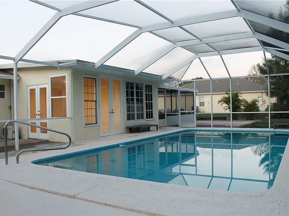 Updated poolDetached garageConverted fl roomTile bathsPrivate screened in roomDouble lotStorm shutters
