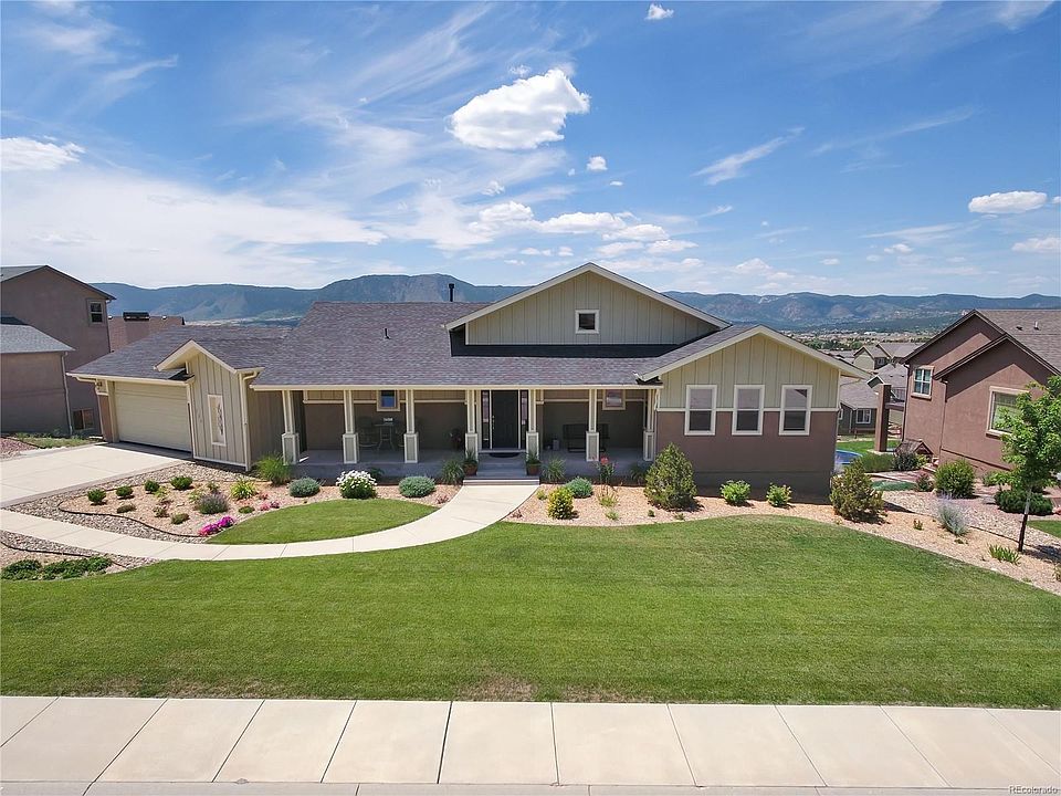 Gorgeous custom Kirella Homes rancher w/ amazing Front Range views! Perfect for entertaining, this open floor plan features a large entryway for guests to gather, flowing into the Living Room capturing the views of the scenic Colorado mountains! The inviting Hearth Room between the Kitchen & Dining Area features a fireplace & a cozy place to relax. The Kitchen offers a gas range top, double ovens, large island, spacious pantry, & gorgeous granite counters! Enjoy sunsets from the Dining Area w/ 180 degree views through the Bay window! Private Master Bedroom retreat with a gorgeous ensuite and walk-in closet also has views of the Front Range and Pikes Peak in addition to access to the spacious composite deck! The lower level offers two additional bedrooms, a full bathroom, workout room, 25x25 storage room, and a large Family Room with a wet bar that walks out onto a 19x22 concrete patio! This home backs to a walking trial, is close to the neighborhood parks, and has easy access to I25!
