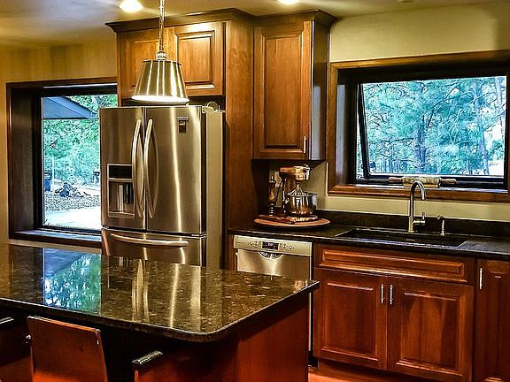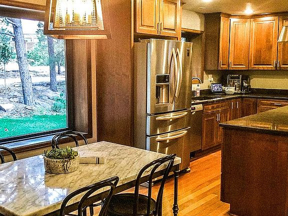This 6-month lease is in a beautiful wooded and spread out neighborhood tucked into the foothills of District 20 school district. It will feel like you live in a mountain retreat but you are right in the convenience of the Springs. As you come up the flag cul-de-sac you will see two houses and lots of beautiful trees. When enter your ranch floorplan midcentury modern home, lovingly called the ModLodge, the kitchen is to your left with wood floors, granite countertops, and stainless kitchenaid appliances (gas stove, double convection ovens, microwave, refrigerator) Bosch dishwasher, upgraded disposal and wine fridge in island. All cabinets are whisper close with pot drawers, lazy susan and a pull out spice rack. The two-way wood-burning fireplace draws you from the kitchen into the vaulted living and dining room. A retracting 100" projector screen easily tucks away to reveal your huge sliding glass doors which lead to the upper deck with mountain views in the daytime and twinkling city night time vistas. The Air Force Academy is just over the ridge so the Thunderbirds' flightpath for graduation is directly overhead and the gliders learning to fly and planes dropping cadets learning to parashoot are a common afternoon sight from the deck. To the left of the kitchen and living room are two bedrooms and a full bathroom with tub/shower and double sink vanity. To the right is the laundry with included oversized washer and dryer and the master suite. The master bedroom is spacious with huge views of the same ridge as the deck that you will adore waking up to each morning. The modern master bath has a double vanity and tankless hotwater heater for endless hot showers from your double shower heads, a hand wand, and body jets. The master bath also features a programable towel warmer, skylight and more views from the window. As you head downstairs, you come to a spacious open living room, another wood burning fireplace stove that can warm the entire downstairs in the winter if you choose. There is also central A/C for the summer time which is something you should be aware that not all homes in the Springs have. A bumper pool/poker table will keep you and your friends entertained along with the mini kitchen perfect for when you are barbequing on your huge lower deck. Walking out through the sliding glass doors brings you to the solitude of your hot tub in the forest. From there, you will be able to hear your kids sledding down the hill on the side of the house in the winter and roasting s'mores in the firepit at the bottom of the property in the summer. Your kids will adore running around in the forest and streams with the neighborhood kids in this safe tight-knit community. Coming back inside, past the downstairs kitchen and dining area is a bathroom with a shower and 2 more bedrooms to your right. One is carpeted and one has wood floors perfect for an office or playroom. Our 3 kids shared this wood-floored room with their bunk beds and full-sized bed fitting well. The full bed (crib convertible) and matching dresser will stay. There is a carpeted bedroom across the hall with magnificent windows to look out onto the forest from your queen sleigh bed. Dresser and bench also included. On the other side of the living room downstairs is the boiler room with lots of storage, and a hallway to another huge living room with matching large picturewindows as the upstairs master. This could be used as a game room or media room or a very large 6th bedroom with its own two closets. You will love living in this beautiful updated ModLodge in the Springs. If you have elementary age kids I cannot more highly recommend our D20 Rockrimmon Elementary School. It is a small school of about 300 students and after living all around the world we have enjoyed this school by far the most. The tight-knit community there will know you and your child by name the first week. Their IB curriculum includes Spanish language classes from Kindergarten and the yearly World Tour Day celebration is an immersive learning experience like none other in the city. This 6-month lease will come sparsely-furnished with 1 queen sleigh bed and dresser, 1 full bed which converts to a crib, a kitchen table and chairs, barstools, a washer and dryer, a poker table (convertible to bumper pool) and chairs, tv stand downstairs, 2 wall mounted tvs (one in an upstairs bedroom and one in a downstairs bedroom), a retractable screen and projector in the upstairs living room, wood for the upstairs pass through fireplace and downstairs fireplace, hot tub, downstairs patio's outdoor furniture and lawn tools. Owner will pay for fire mitigation and leaf clean up once yearly by 719 Landscape Design as well as chimney sweeping services for all of your cozy hours by the fireplaces. We can't wait for you to enjoy this beautiful home for yourself. Available TODAY through July 2023! Tenant pays all utilities. Owner pays once yearly fire mitigation property landscaping.