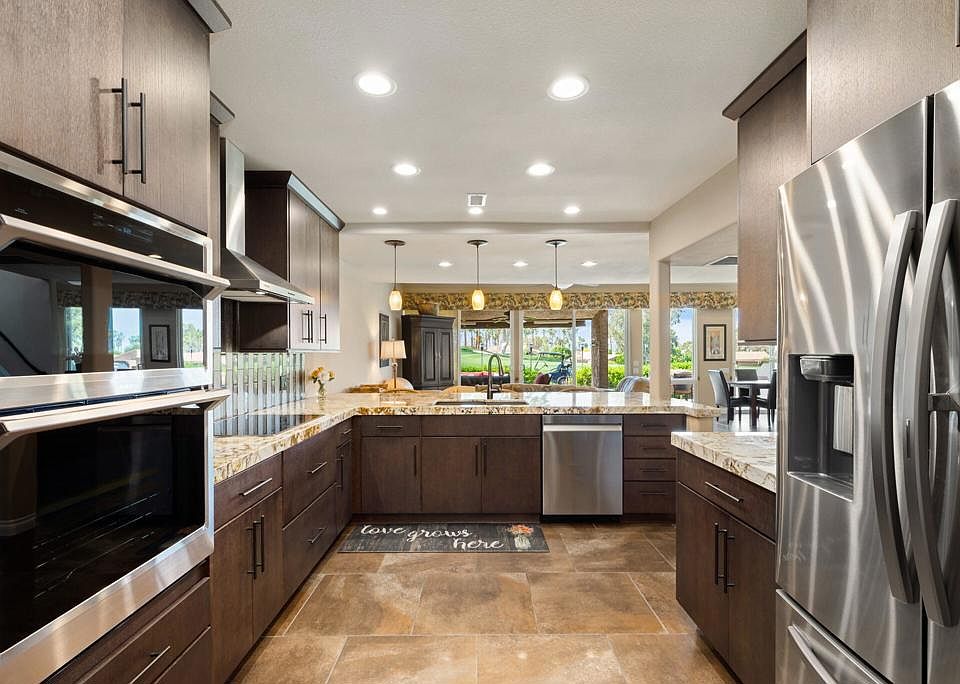 Mountain Views! South Palm Desert! Remodeled! I 3 bd/3 ba 2103 sq ft home. Ironwood Country Club popular Garden Villa home includes three bedrooms each with en-suite bathrooms.(one bedroom used as office)Featuring a cathedral ceiling in the great room with custom window coverings offer a noticeably light and bright open floor plan for entertainment along with amazing mountain views. The kitchen was recently remodeled with stainless steel Samsung appliances, custom cabinets, modern backsplash, granite countertops and breakfast bar. All windows and doors have been replaced. The spacious primary bedroom offers views of the mountains from the large front patio with awning. Entertainment back patio was expanded to allow for a large entertainment area. along with two custom awnings. The home includes two enclosed garages large enough to fit cars with extra storage and golf cart ready space. There is an inside laundry room with an extra storage closet. This bright airy home is in Ironwood Country Club an exclusive member owned club that includes two golf courses, fitness center, tennis & pickleball facilities and elegant Tuscan-style clubhouse. Ironwood is close to the best of the desert that includes world class shopping on El Paseo, dining, McCallum Theatre, The Living Desert, and many outdoor activities. HOA dues include Cable/HBO, wi-fi ,24-hour staffed gate with full time security guards and community pool and spa! Investors 7 day rental rule in this HOA call for detail
