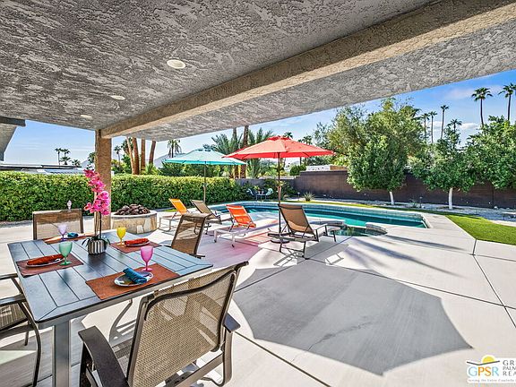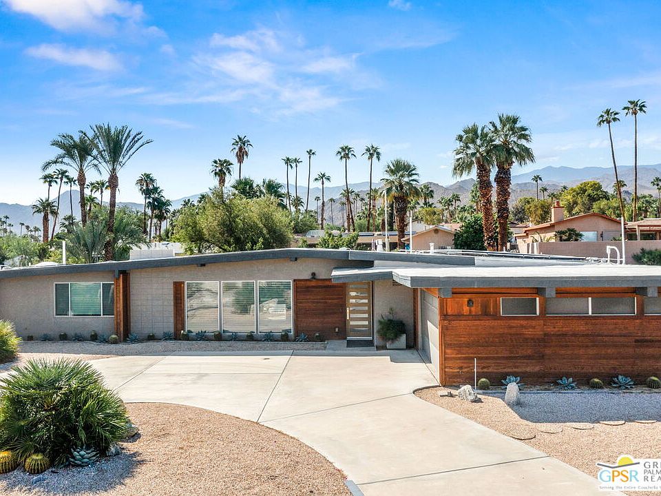 If location is everything, this home in the highly sought-after Silver Spur Ranch neighborhood of South Palm Desert truly delivers. Perfectly situated at the end of a quiet cul-de-sac, the property is South-facing and directly adjacent to Ironwood Park. Its curb appeal is exceptional, featuring striking redwood siding accents, a circular driveway, Milgard windows and doors, and a backdrop of swaying palm trees. This Mid-Century Modern gem underwent a complete renovation in 2018 and has been styled in a chic Contemporary design offering a move-in-ready, turnkey experience. Furnishings are included with just a few exceptions. Step into the backyard and you'll be captivated by sweeping views and a resort-like setting, complete with a saltwater pool, spa, built-in BBQ, and gas fire pit all in a private, serene atmosphere. The detached casita provides a spacious third bedroom and bath, ideal for guests or a private retreat. Inside, the kitchen is a showpiece with an island bar, breakfast nook, Thermador range, and Maytag refrigerator. A fully owned solar system, installed in 2022 adds modern efficiency and value. Silver Spur Ranch, a charming historic neighborhood dating back to the 1950s, is celebrated for its diverse architecture and stunning mountain scenery. The home is minutes from El Paseo's premier shopping and dining, directly across from the Living Desert, close to several golf courses, and just five minutes from scenic trailheads offering hikes from one to sixteen miles. This is a rare opportunity to own a dazzling, impeccably updated home in one of Palm Desert's most desirable communities.